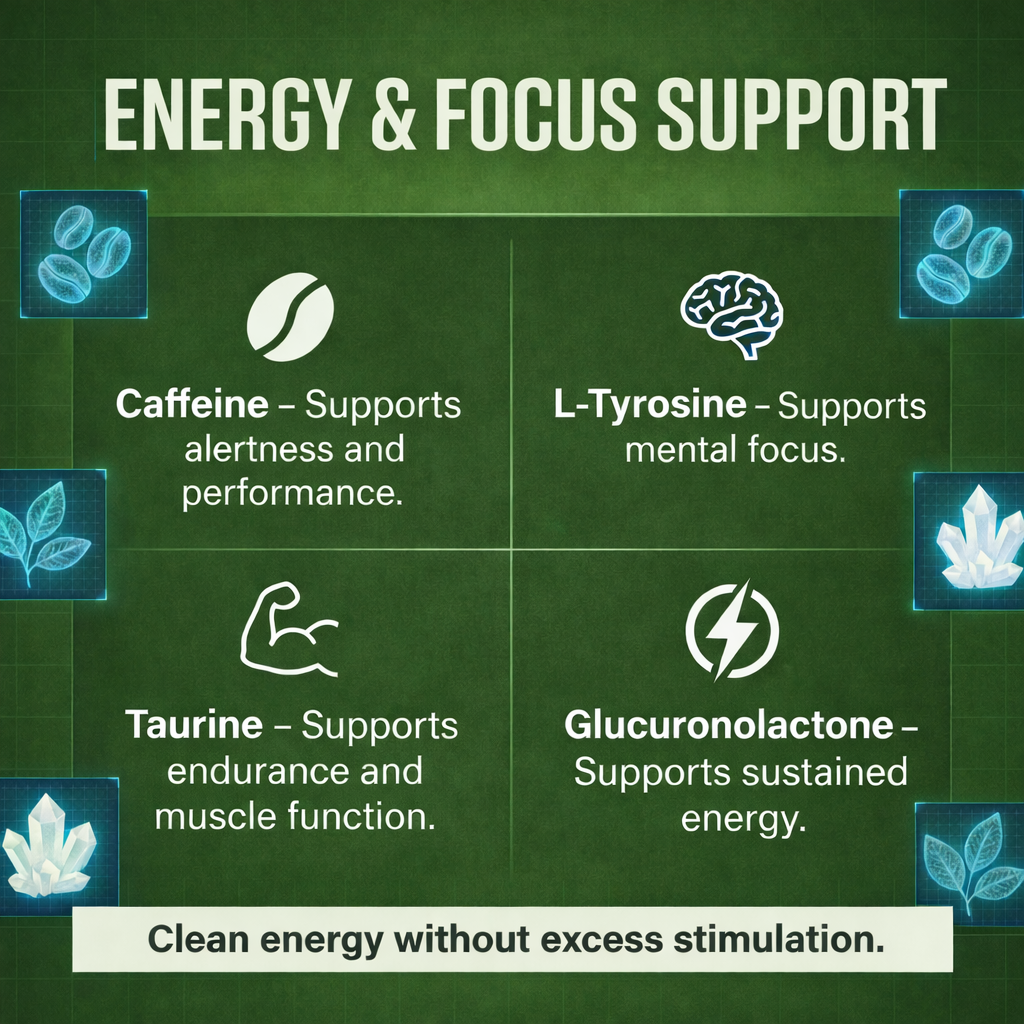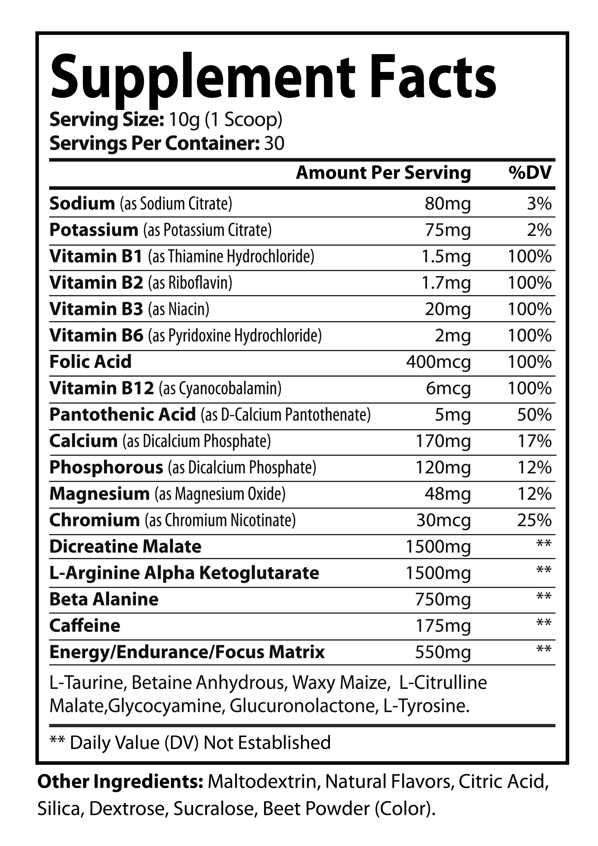 Plus key vitamins & minerals including B1, B2, B3, B6, Folate, B12, Sodium, Potassium, Calcium, Magnesium, and Chromium. How to UseMix 1 scoop (10 g) with 6–8 oz of cold water. ⚠️ WarningsContains caffeine (175 mg per serving). Not recommended for children, pregnant or nursing women, or individuals sensitive to caffeine. Avoid taking close to bedtime. Quality / TrustThird-party tested for quality and purity. Made in the USA in a GMP-certified, FDA-registered facility. |
