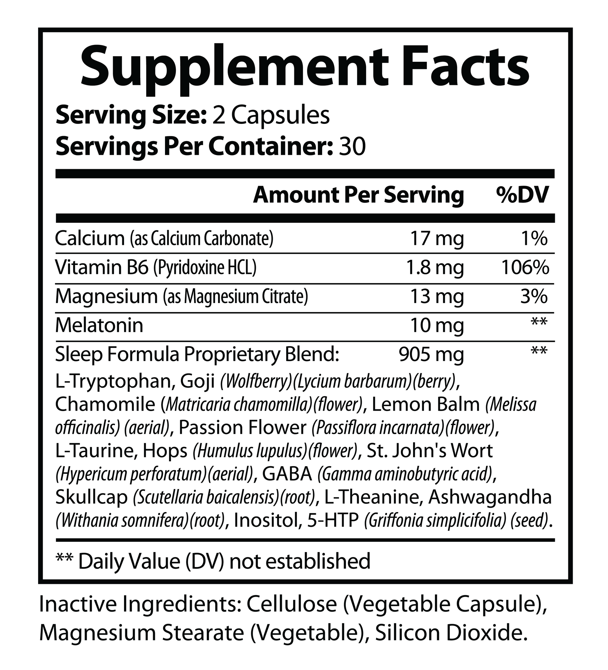 How to UseTake 2 capsules with water 30–60 minutes before bedtime, or as directed by your healthcare professional. What’s InsideThis formula features Melatonin, key minerals, and a proprietary blend of ingredients including: Quality You Can Trust