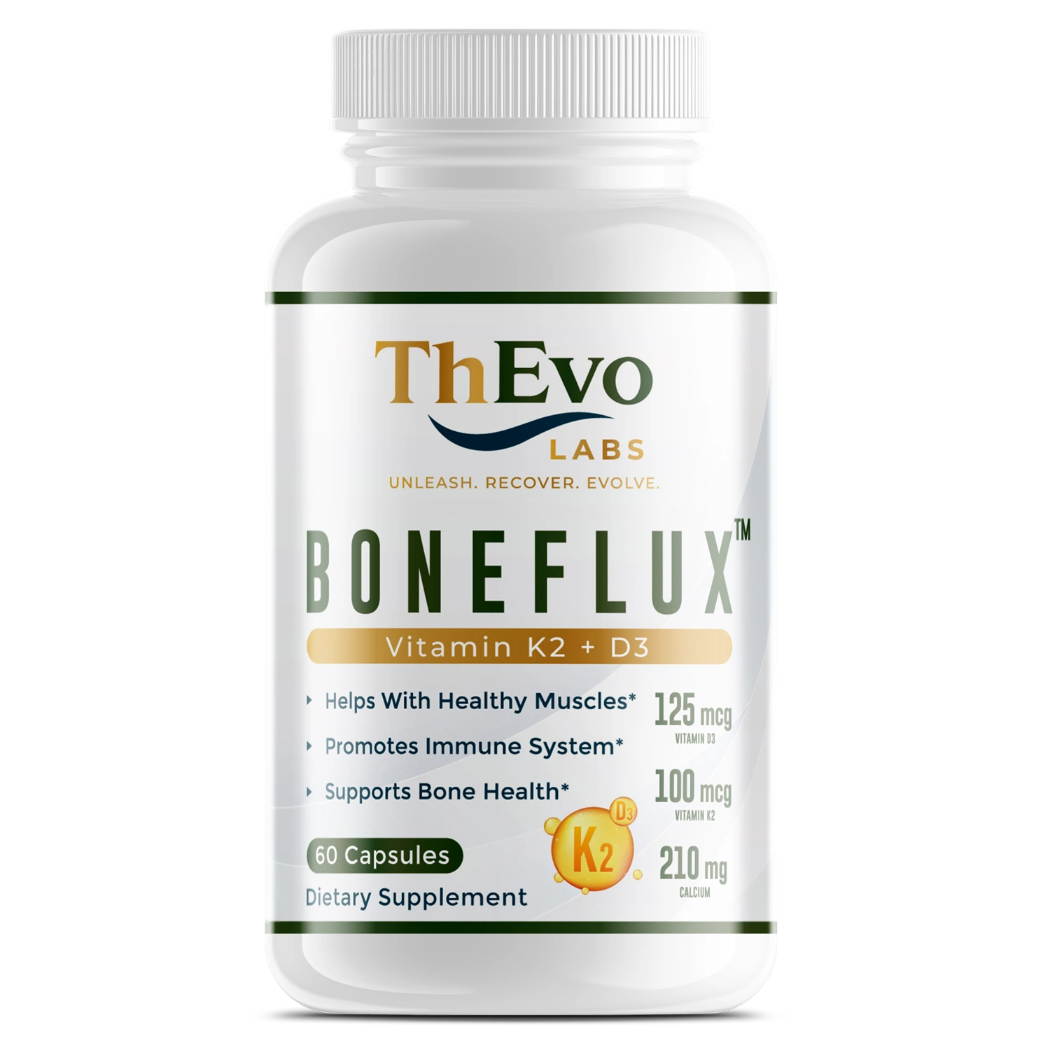 Boneflux™ is a premium daily formula combining Vitamin D3 (125 mcg) and Vitamin K2 (MK-7, 100 mcg) to support strong bones, immune health, and cardiovascular wellness.*